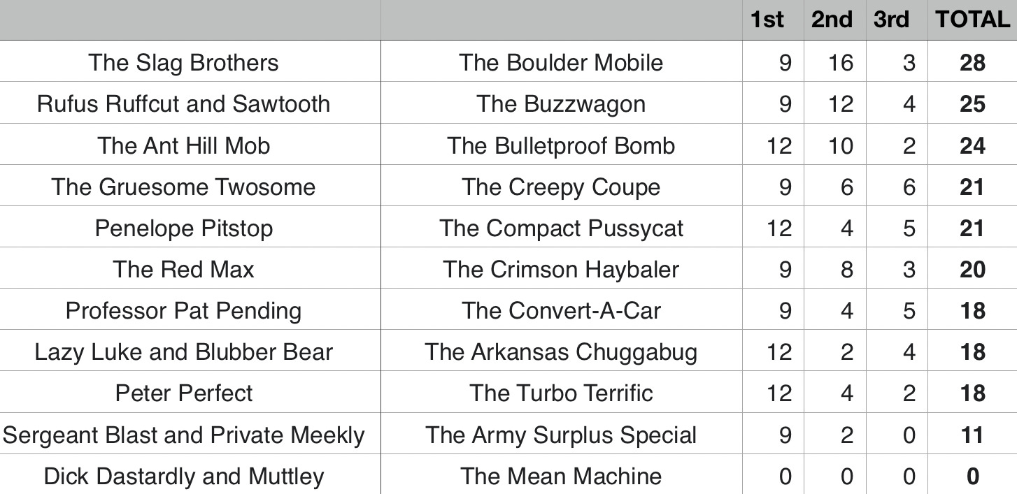 It’s also interesting on the origins of the show, as well as giving me an excuse to share the single best page on Wikipedia – a breakdown of all the Wacky Races results. The one thing that page fails to do is allocate points to the contestants. I’ve corrected this – as I say, always up for a few minutes of distraction – in the chart below (3 for a win, 2 for 2nd, 1 for 3rd). So we declare The Slag Brothers the Wacky Champions of Champions, as is only right and proper. Fans of the Ant Hill Mob might want to massage the points allocation in order to get a result they prefer.