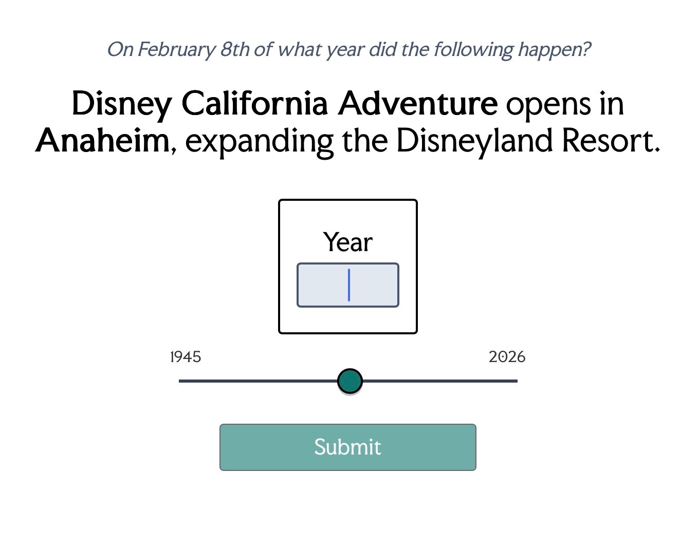 There are quite a few games out there to test your knowledge of historical events. This is a nice one. It picks events from that day in history, and gives you a range to choose from.
