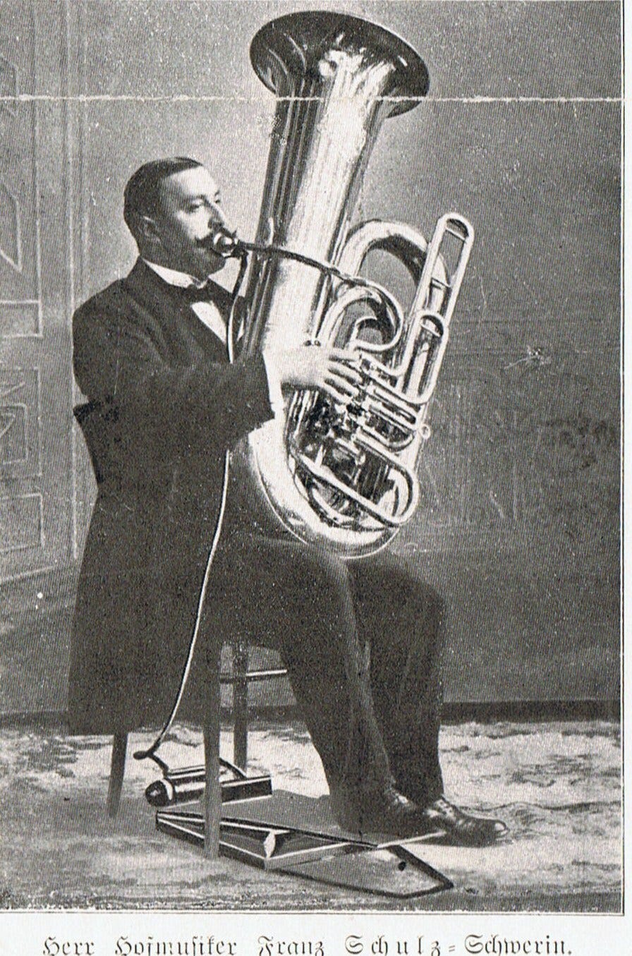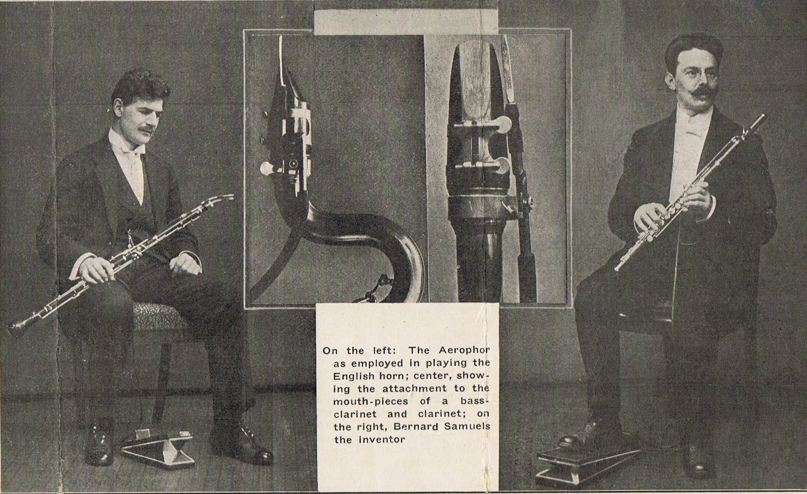 The Samuels Aerophone (or Aerophon or Aerophor or Aerophore – nobody can quite decide) was invented by Dutch flautist Bernard Samuels in 1912. It’s a device designed to help wind players play long notes without having to worry about the limitations of the human lung. A small foot-operated bellows connects to a rubber tube which leads to a mouthpiece – this sits in the corner of the player’s mouth, next to the instrument’s mouthpiece, and supplies air to the player. A water reservoir and electric light bulb make sure that the air supply is appropriately warm and damp, to match the player’s breath. Et voilà! Mechanical circular breathing. A magical device, which, according to this 1914 article, “will tinge the orchestra of the future with marvelous and hitherto unknown colors and will moreover serve a finer and more humanitarian end – it will conserve the player’s health and nervous energy.”